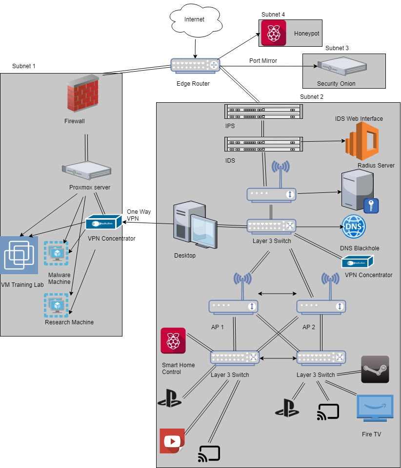 If you’ve spent any time in the world of cyber security, you’ll know that one of the things expected is continuous learning. As a security professional you are expected to live and breathe this stuff. I’ve found that some of my greatest learning moments come from when I am building and working on my network. I’d learn about something at work and decide to come home and see if I can replicate it there. Thankfully my wife had the patience of a Saint as I broke the network multiple times. I thought it might be fun to look back at my network over time