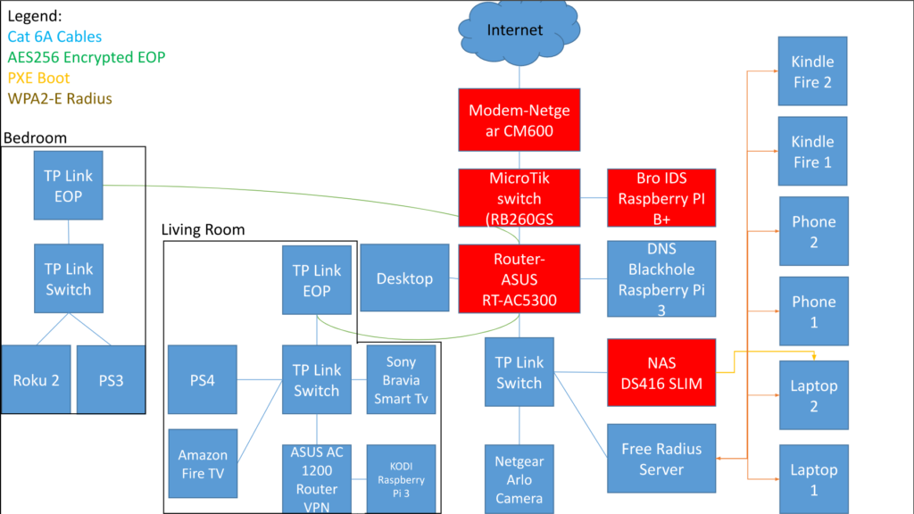 It’s pretty much the same as my original network 2 but this time I tried to add more colors to define things. At this point in my live I was learning about Mikrotik devices. spanning ports, and PXE booting. What I was trying to do with this network was to have the Microtik switch copy all network traffic over a span port to my IDS (running on a RPI3b+). I also had an old laptop that couldn’t run windows anymore. I wanted that laptop to PXE boot Linux (Mint Cinnamon) off a NAS.