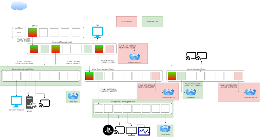 As I went through these requirements I started brainstorming possible ideas. My pfSense router has 5 ports on it (not counting the WAN) so my initial thought was to simply connect another router to the LAN2 port and make a different subnet. That’s what I’ve done with my Mikrotik before, but that was all stuff located in the basement with me. Unfortunately that solution wouldn’t work here. My house is 3 stories (basement + 2 floors) and the router in the basement doesn’t reach the 2nd floor. So that means IoT devices on the top floor won’t connect to a router in the basement.