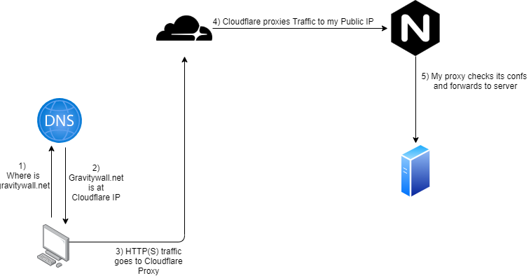 With normal traffic your system will query an authoritative DNS server to get the IP, but with Cloudflare being my authoritative DNS it will return its own IP as the server. Then Cloudflare will proxy the traffic to my actual source.