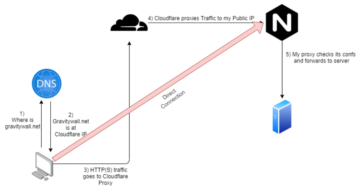 When I was analyzing the logs with my coworker we started to hypothesize about how to manipulate my proxy to allow access to these servers without going through Cloudflare. Looking at how NGINX works we know that it listens for a specific URL and then forwards that to the appropriate server based on the config file, which is why simply going to my public IP didn’t work for the bots.