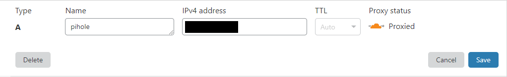 Now that we have all of our requirements managed let’s talk about the set up. In your Cloudflare dashboard you’ll need to make a new record for pihole.yourdomain.tld (or whatever you want). For me it’s pihole.gravitywall.net. Use the public IP address of your Pi-Hole server; I’d imagine for most of us that is going to be our home IP.