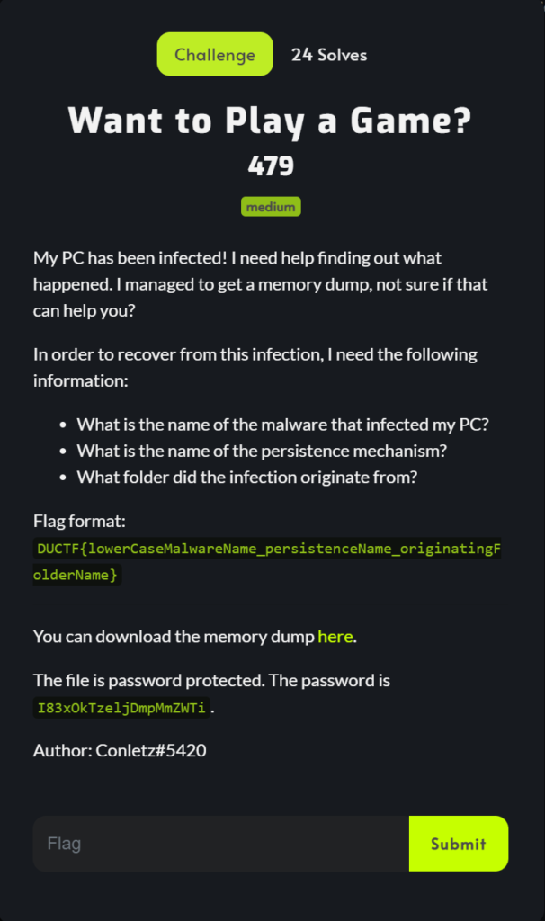 I was working on the Memory Forensics Challenge for the Down Under 2021 CTF today and had a lot of fun so I wanted to take a moment to write up my solution for it. The challenge, one of several challenges was a three part answer.