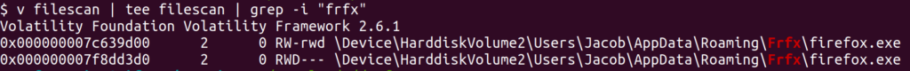 First I need to find the location of the files memory address as Volatility has no real concept of file paths. Thankfully Volatility has a helpful plugin to print the memory address of every loaded file on the system. This command can print out a very large amount of data so to avoid scrolling through everything we’ll filter down to what we know is probably bad.
