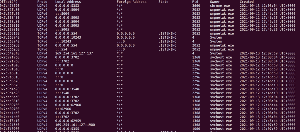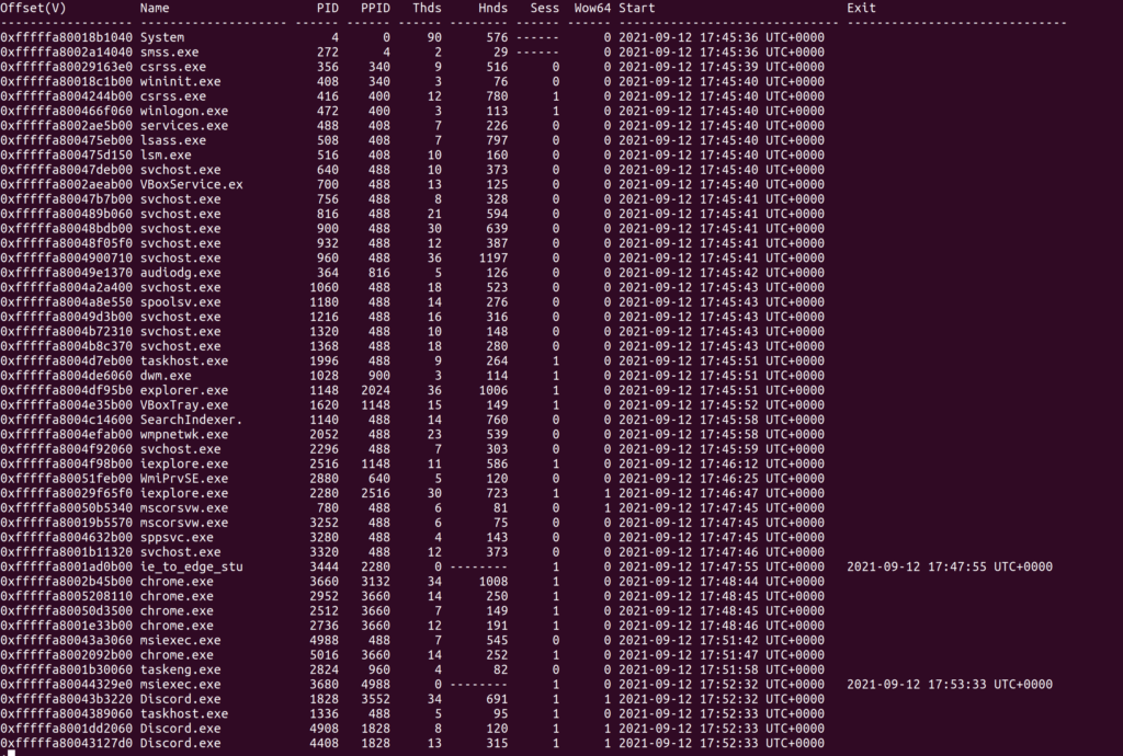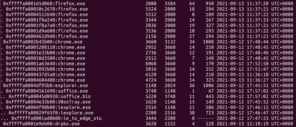 In this case malfind did actually detect the malicious program (more on that later) but I didn’t notice because it also hit on some clean processes. It’s not uncommon for malfind to hit on legitimate processes so I had to move on. Time to see what processes were running at the time.