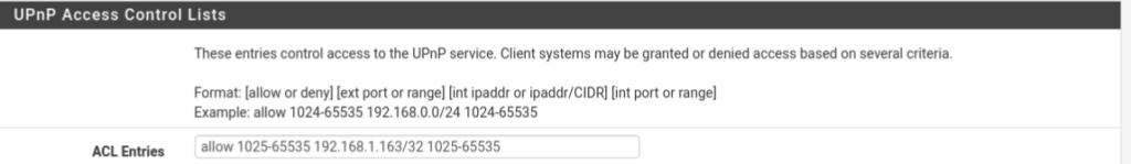 At the bottom of the page fine UPnP Access Control Lists and then the box for ACL Entries. We’ll be entering the following information there (replace $IP with the static IP you set for your Xbox earlier).