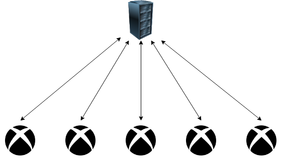 This is the “newer” model for gaming but it’s existed in computing for a long time. With the Client-Server model all of the clients (Xboxs) send their data to server which collects it all, correlates it, merges it, and then redistributes the merged data back to the clients.