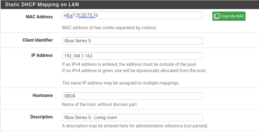 In your pfSense go to Services -> DHCP Server -> [DHCP Static Mappings for this Interface] Add. Fill in this information and provide your Xbox with a static IP. The only fields you need to fill out are;
