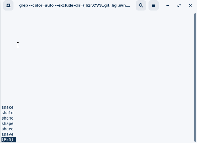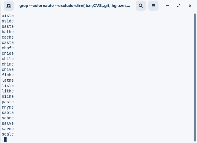 This command in short searches through the linux American English Dictionary looking for words that exactly 5 letters long, have an E at the end, and don’t have an H at the start or an S at the second to last letter. Then is does a second grep this time removing any words with the letters OU.