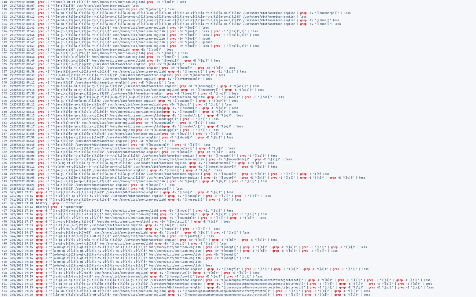 This became a pain and I had to type this command out every single guess. Occasionally I was able to hit up arrow and modify the command but more often I was retyping it by hand every time to make sure I got the script correct. Here’s a look at my bash history over the last several days.