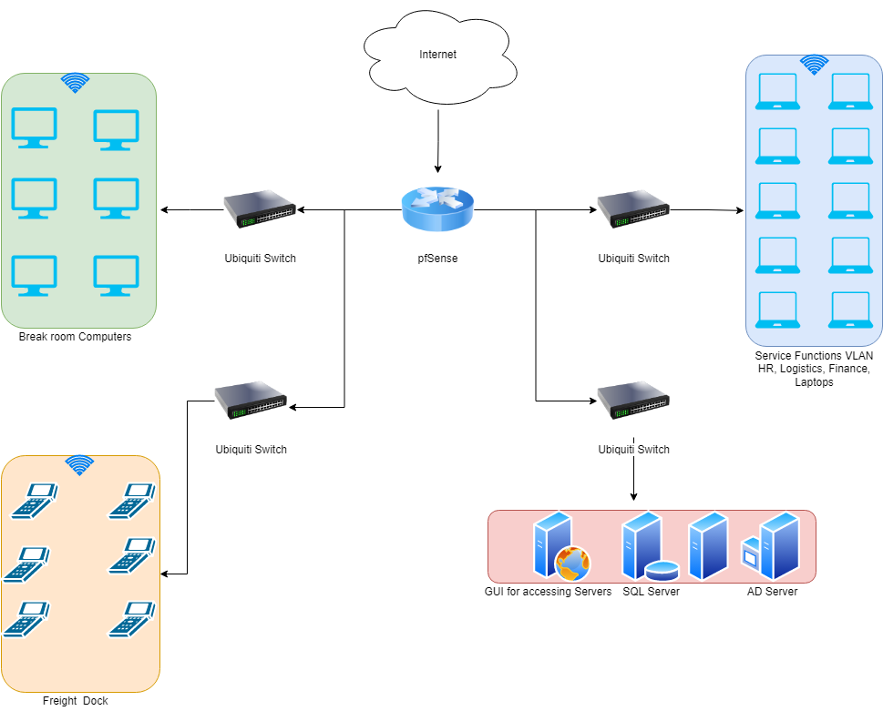 Take a look at our network here. It’s a warehouse, so its primary functions are to import items, store them, and then ship them out on request. This is the primary mission of the Warehouse (to go with Military terms again). In order to do this mission, the warehouse needs some things. The wireless network which powers the handheld scanners and the SQL server which records all the moving items are both examples of things required for the warehouse to function.