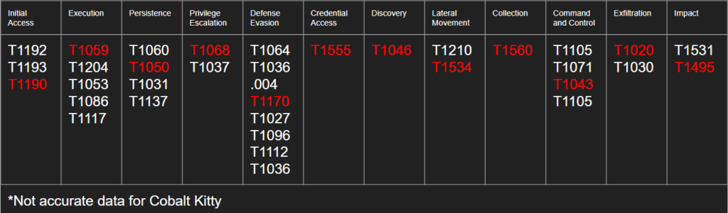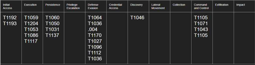 | Initial Access | Execution | Persistence | Privilege Escalation | Defense Evasion | Credential Access | Discovery | Lateral Movement | Collection | Command and Control | Exfiltration | Impact |