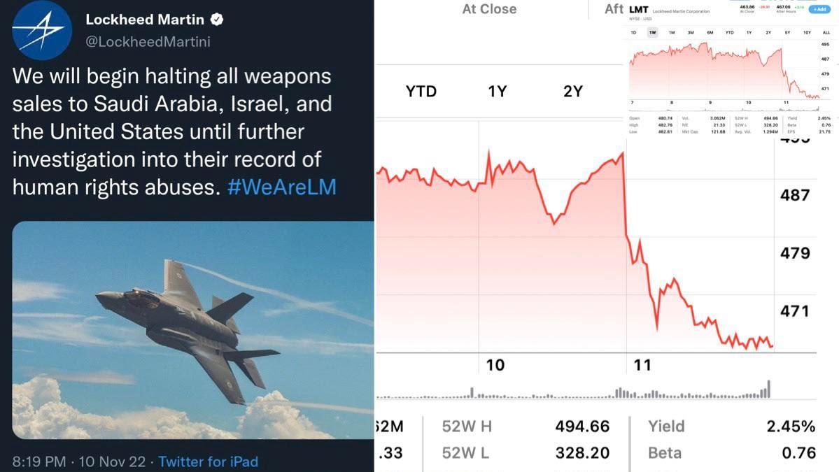 Twitter users pretending to be Lockheed Martin (notice the account is @lockheedmartini) announced that they were halting sales to Saudi Arabia, Israel, and the US. This caused an immediate crash in their stock to the tune of billions in value.